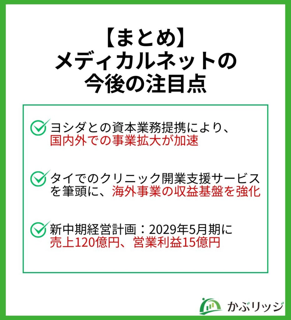今後は、国内外での事業展開の進捗、特にタイでの開業支援サービスの成果や新中期経営計画の達成度合いに注目していきましょう。