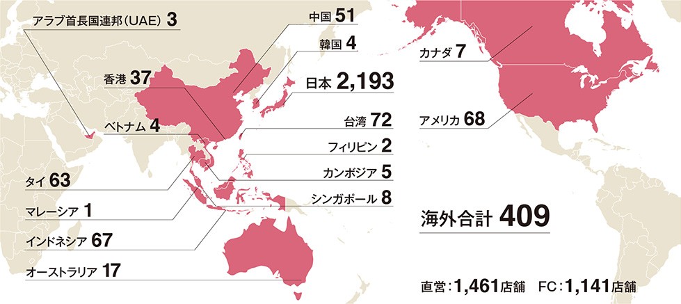 焼肉や寿司、定食など大手チェーンをいくつも保有し、外食事業の店舗数は、フランチャイズ店も合わせて2,602店舗もあります。