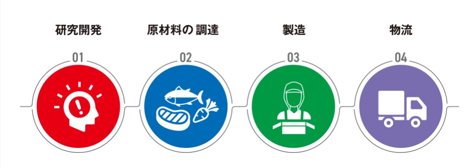 商品の研究開発から、食材の調達、製造、そして物流までを一貫して管理しており、グループシナジーの創出と業態ごとに差別化された商品の提供を実現しています。