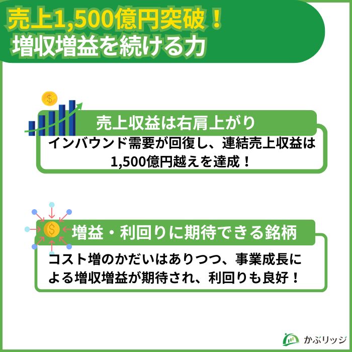 既存店の回復やインバウンド需要の増加に加え、M&Aによる事業拡大が売上成長に寄与しています。