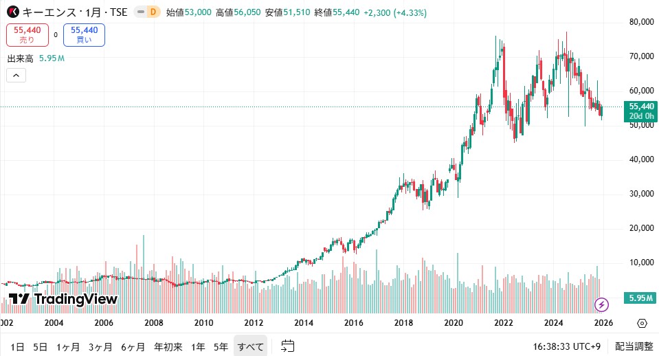 株価は2026年1月9日時点で57,670円と、日本で3番目に高い水準にあります。