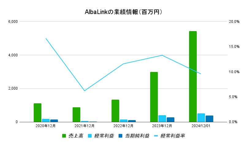 AlbaLinkの業績を見てみると、売上高は一貫して右肩上がりで成長しており、4年間で約6倍という驚異的な成長を遂げています。
