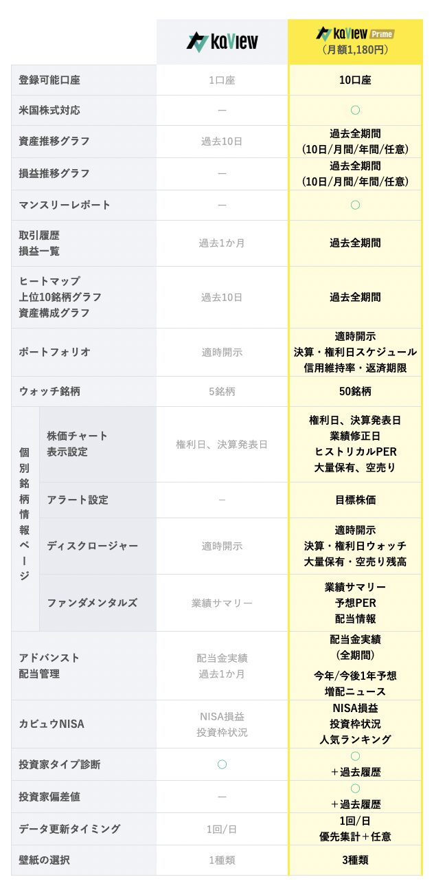 複数口座の一元管理や詳細な取引データの分析といったカビュウのメリットを最大限活用するには、 有料プランへの加入が必要となります。