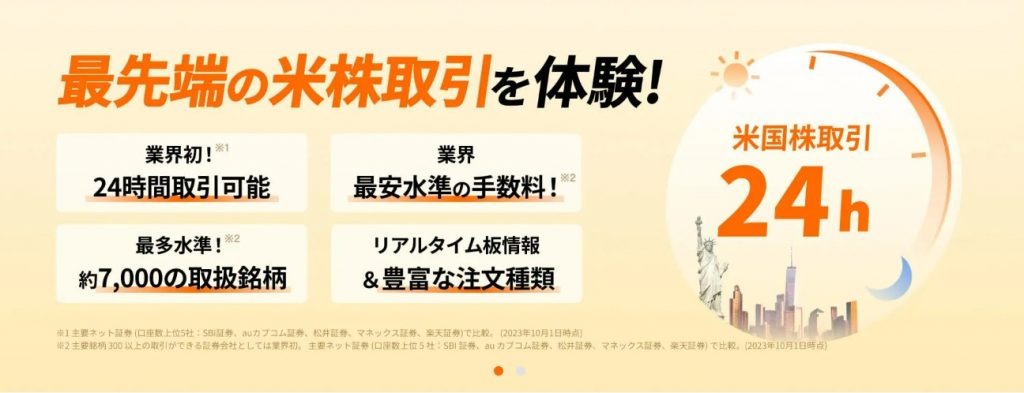 取扱銘柄数 | 約7,000銘柄(ADR,ETFを含む) NYSE(ニューヨーク証券取引所)・NYSE Arca・NYSE American・NASDAQ(ナスダック証券取引所)、に上場する銘柄 |